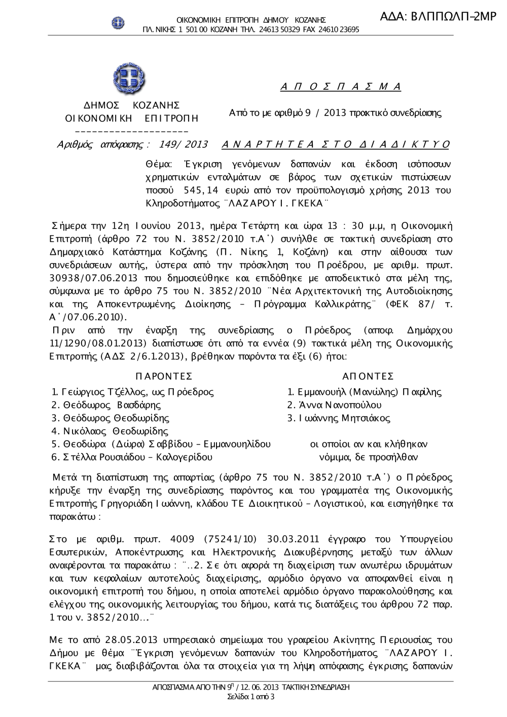 149-2013 Έγκριση γενόμενων δαπανών κληρ. ΛΑΖΑΡΟΥ Ι. ΓΚΕΚΑ.pdf (Έκδοση 1.0)