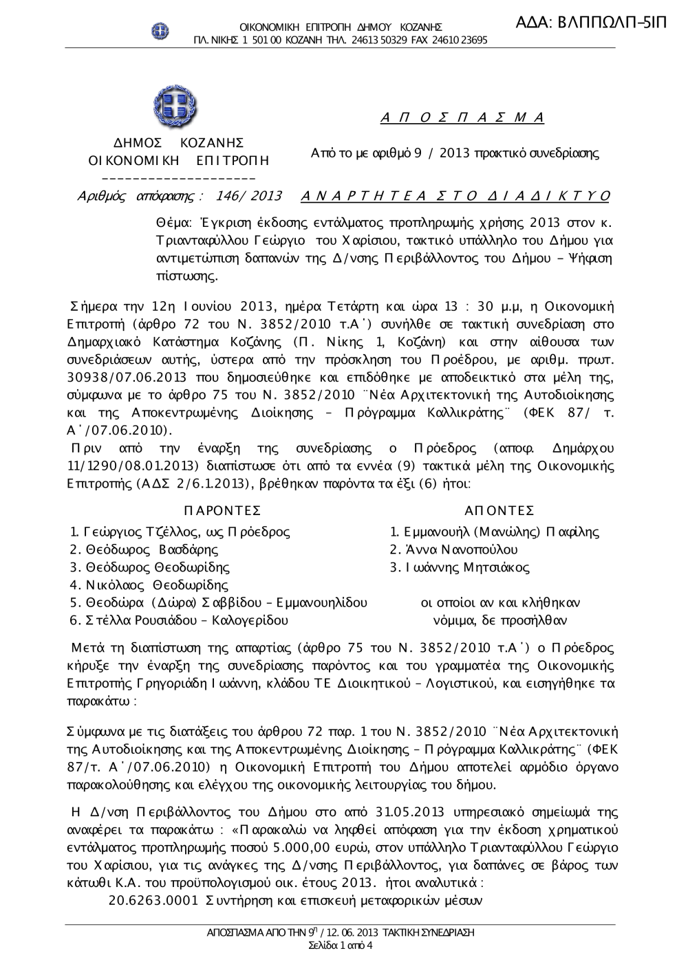 146-2013 Έγκριση εντάλματος προπληρωμής στον Τριανταφύλλου Γεώργιο του Χαρίσιου.pdf