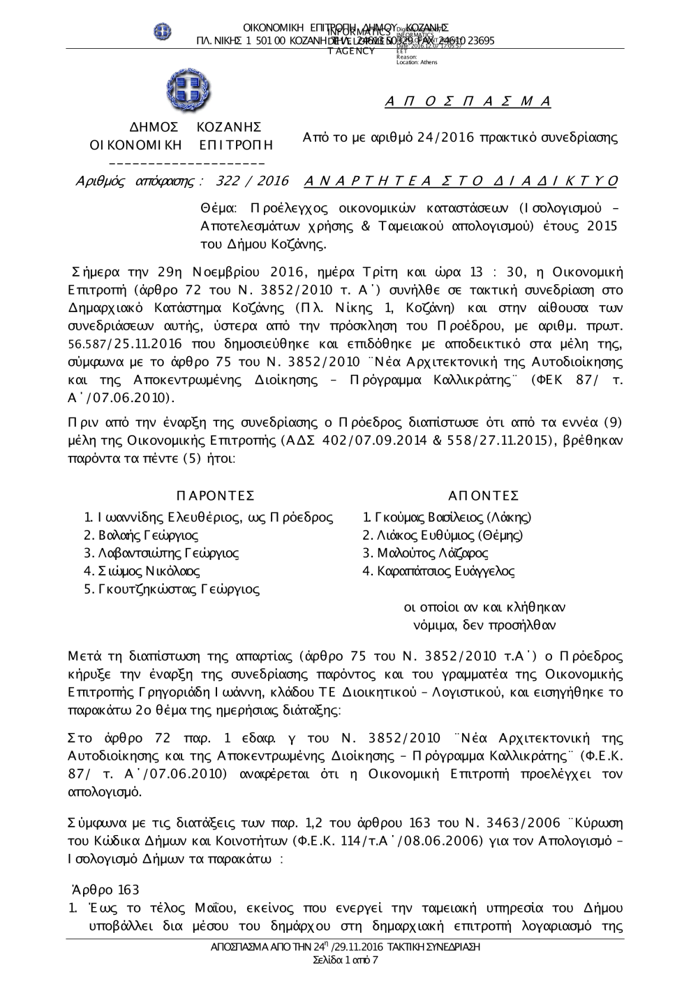 322-2016 Προέλεγχος Ισολογισμού και Απολογισμού 2015 Δήμου Κοζάνης