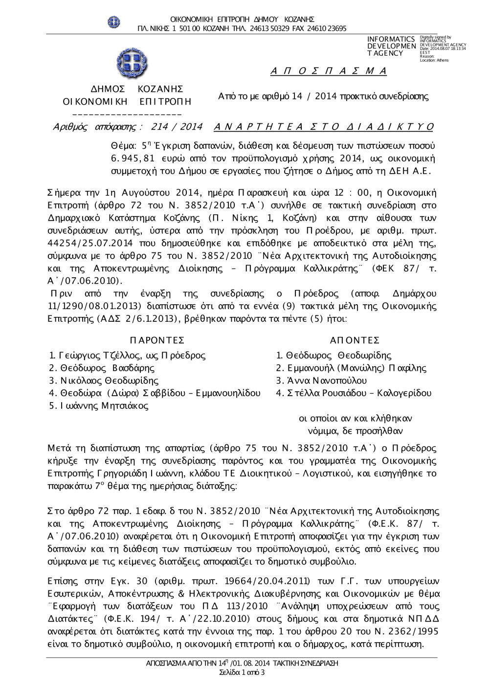 214-2014 5η Έγκριση δαπανών, διάθεση και δέσμευση πιστώσεων για εργασίες ΔΕΗ ΑΕ.pdf