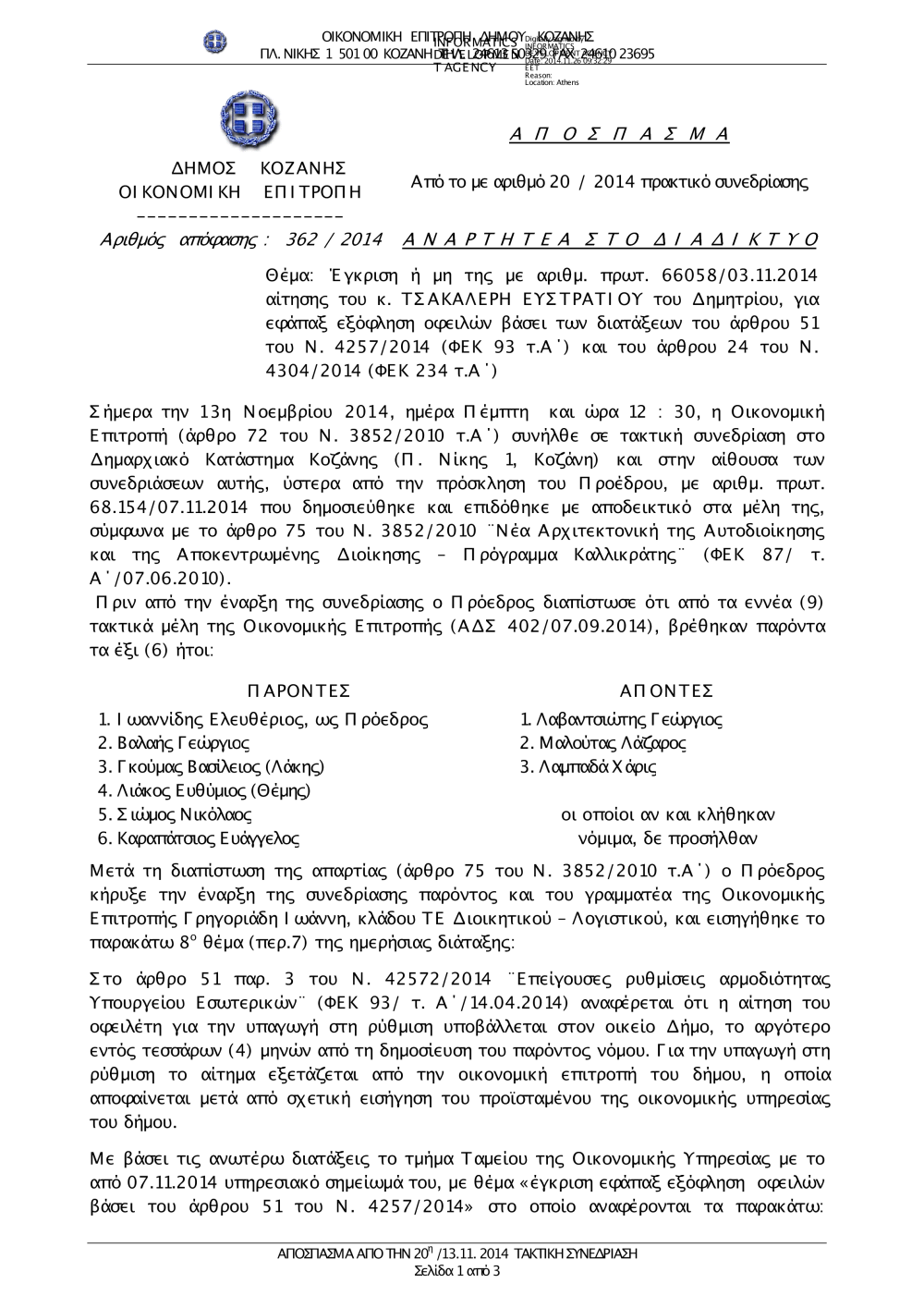 362-2014 Έγκριση εφάπαξ εξόφλησης οφειλών του Τσακαλέρη Ευστρατίου του Δημητρίου