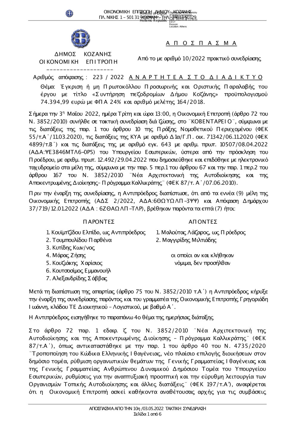 223-2022 Έγκριση Πρωτοκόλλου Προσωρινής & Οριστικής παραλαβής για Συντήρηση πεζοδρομίων Δήμου Κοζάνης.pdf