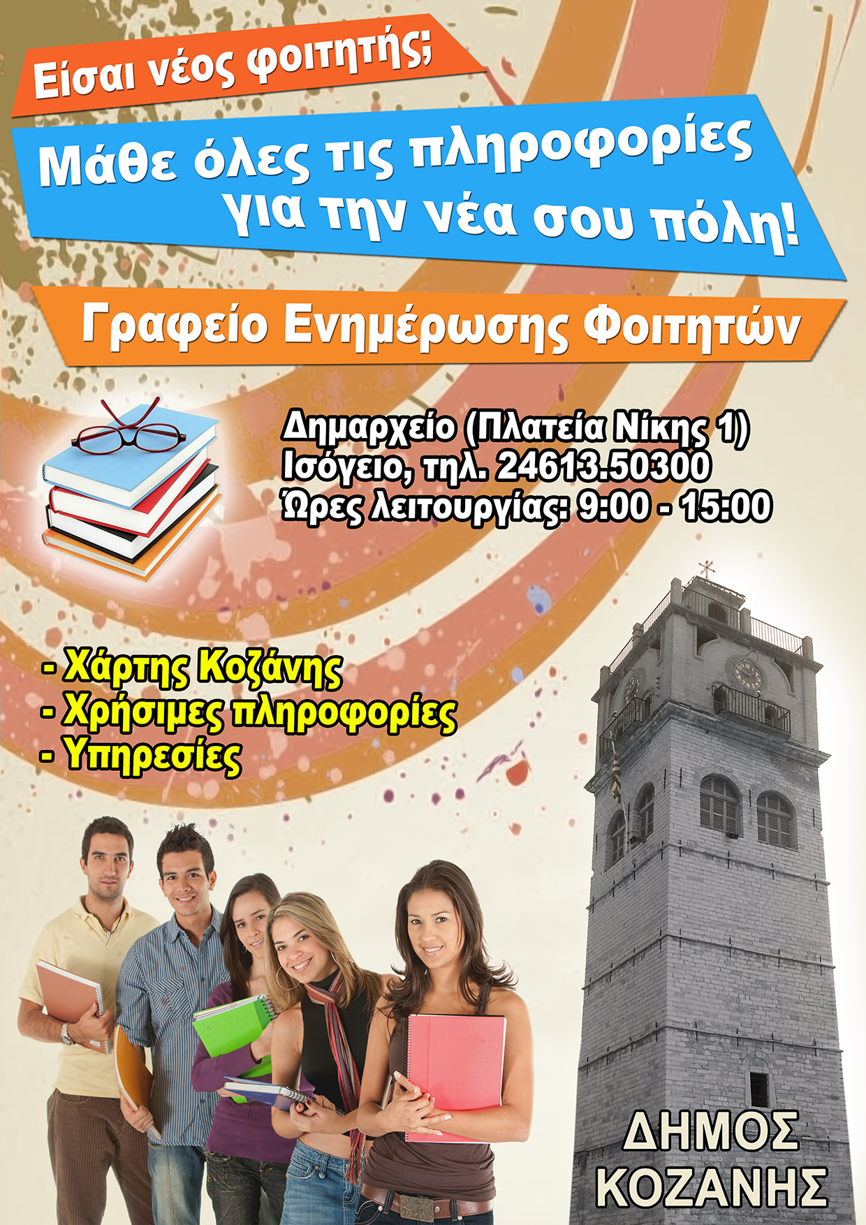 Ο Δήμος Κοζάνης προχώρησε στη σύσταση γραφείου υποδοχής πρωτοετών φοιτητών. Το γραφείο βρίσκεται εντός του Δημαρχείου Κοζάνης (στο ισόγειο) και έχει ως στόχο να δίνει βασικές πληροφορίες για την Κοζάνη στους πρωτοετείς φοιτητές του Πανεπιστημίου και του ΤΕΙ Δυτικής Μακεδονίας.