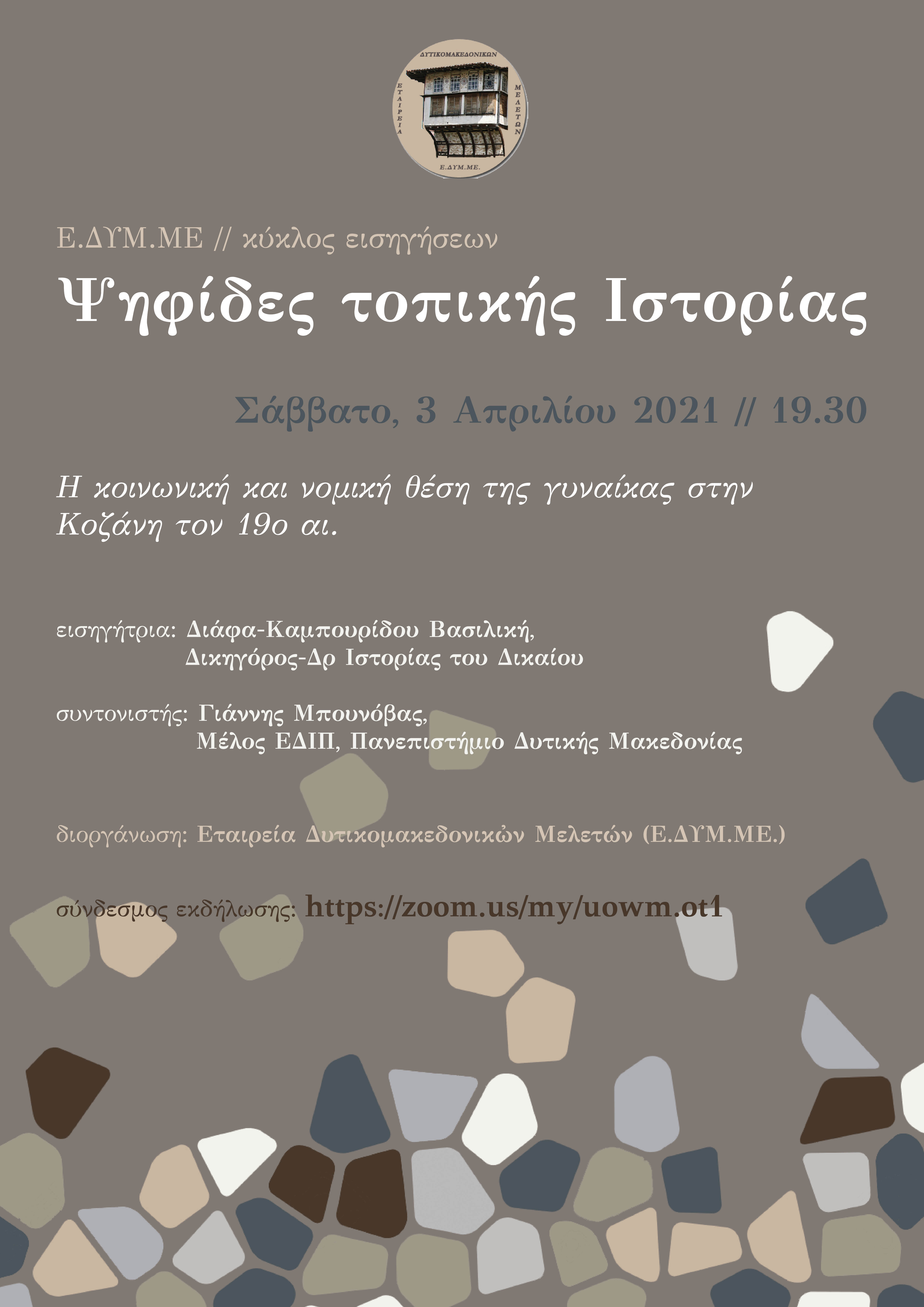 Η Εταιρεία Δυτικομακεδονικών Μελετών (Ε.ΔΥΜ.ΜΕ.) ΣΑΣ ΠΡΟΣΚΑΛΕΙ στον  κύκλο Εισηγήσεων που διοργανώνει με αντικείμενο την Ιστορία  της Δυτικής Μακεδονίας και γενικό τίτλο " Ψηφίδες Τοπικής Ιστορίας". Οι Εισηγήσεις θα διεξάγονται διαδικτυακά κάθε Σάββατο και ώρα 7.30μμ. από τον Απρίλιο ως και το Μάιο του 2021.