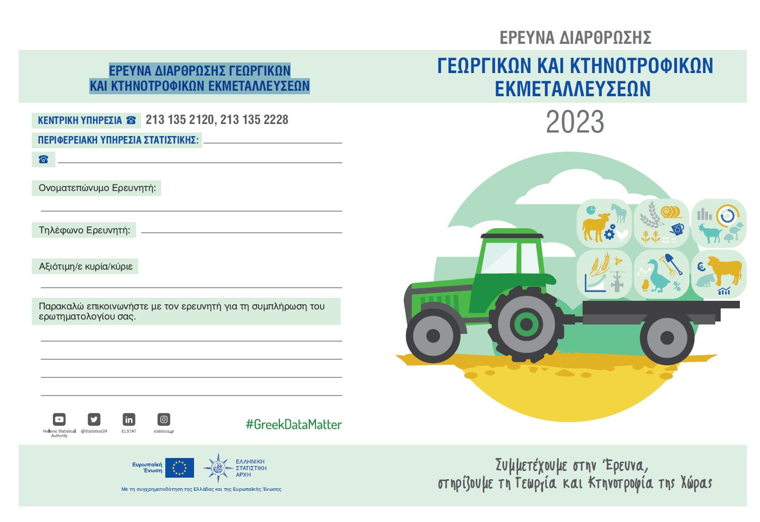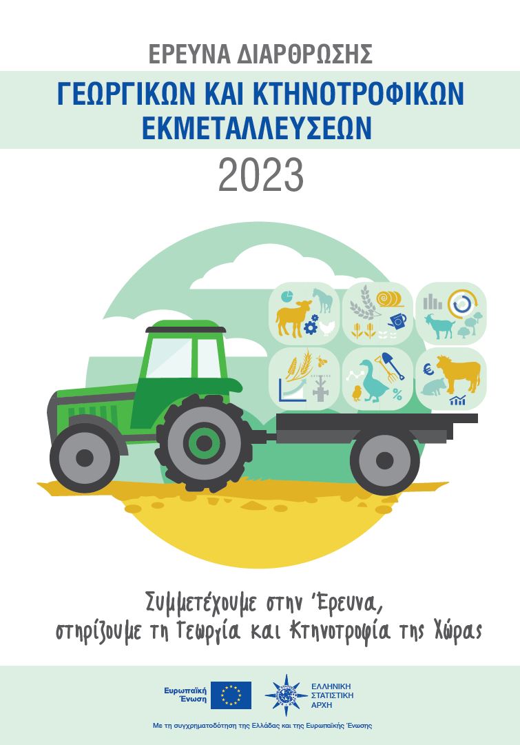 Η Ελληνική Στατιστική Αρχή (ΕΛΣΤΑΤ), ως αρμόδιος φορέας για την ανάπτυξη, παραγωγή, και διάδοση των επίσημων στατιστικών της Χώρας αναπόσπαστο μέρος των οποίων είναι οι στατιστικές που αναφέρονται στη Γεωργία - Κτηνοτροφία, διενεργεί κατά το χρονικό διάστημα Ιανουαρίου - Μαρτίου 2024 την Έρευνα Διάρθρωσης Γεωργικών και κτηνοτροφικών Εκμεταλλεύσεων, έτους 2023, σε όλη τη Χώρα.
