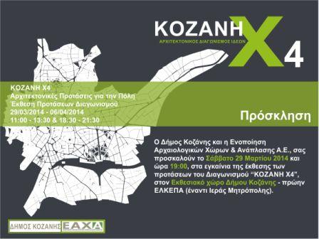 Ο Δήμος Κοζάνης και η Ενοποίηση Αρχαιολογικών Χώρων & Ανάπλασης Α.Ε., σας προσκαλούν το Σάββατο 29 Μαρτίου 2014 και ώρα 19:00, στα εγκαίνια της έκθεσης των προτάσεων του Διαγωνισμού “ΚΟΖΑΝΗ Χ4”, στον Εκθεσιακό χώρο του Δήμου Κοζάνης – πρώην ΕΛΚΕΠΑ (έναντι Ιεράς Μητρόπολης).