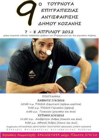 Ο Οργανισμός Αθλητισμού Πολιτισμού Νεολαίας του Δήμου Κοζάνης σε συνεργασία με τον Σύλλογο Επιτραπέζιας Αντισφαίρισης Κοζάνης διοργανώνει το 9ο τουρνουά επιτραπέζιας αντισφαίρισης που θα διεξαχθεί το Σάββατο 7/4/2012 και την Κυριακή 8/4/2012 στην αίθουσα πολλαπλών χρήσεων του Πειραματικού και 4ου γυμνασίου Κοζάνης.