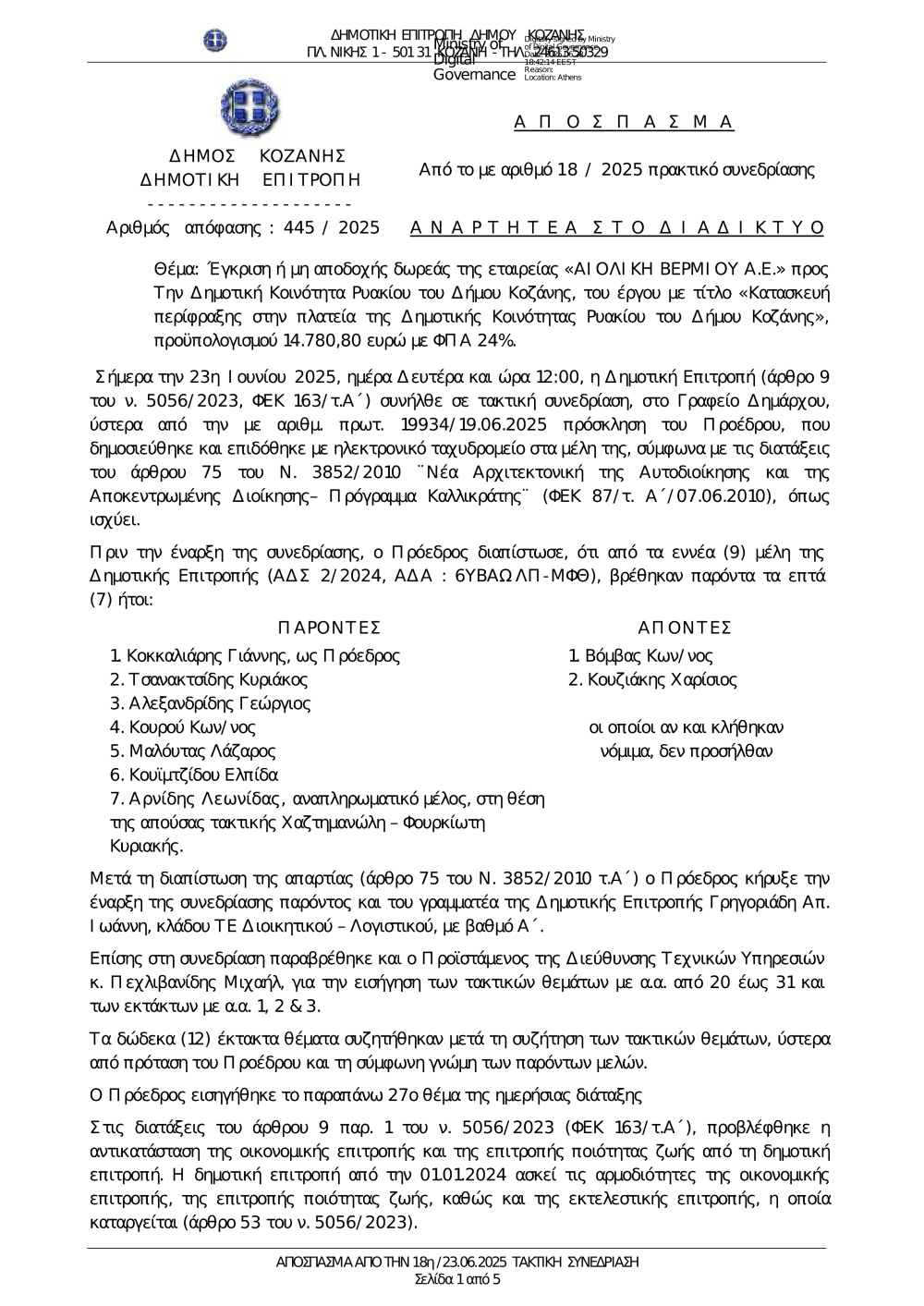 445-2025 Αποδοχή δωρεάς από ΑΙΟΛΙΚΗ ΒΕΡΜΙΟΥ για Περίφραξη Πλατείας στην Κ. Ρυακίου.pdf (Version 1.0)