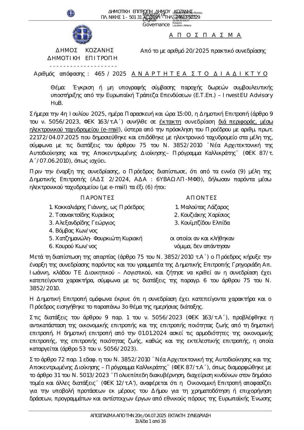 465-2025 Έγκριση υπογραφής σύμβασης δωρεάν υποστήριξης από την Ευρωπαϊκή Τράπεζα Επενδύσεων.pdf (Version 1.0)