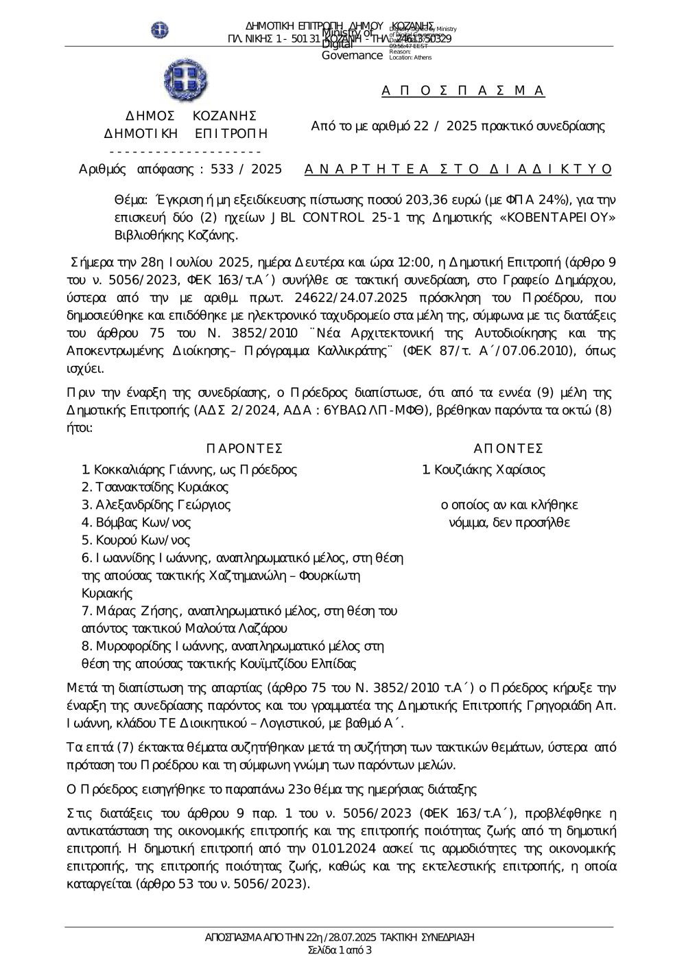533-2025 Εξειδίκευση πίστωσης 203,36 € για συντήρηση 2 ηχείων της ΚΔΒΚ.pdf (Version 1.0)