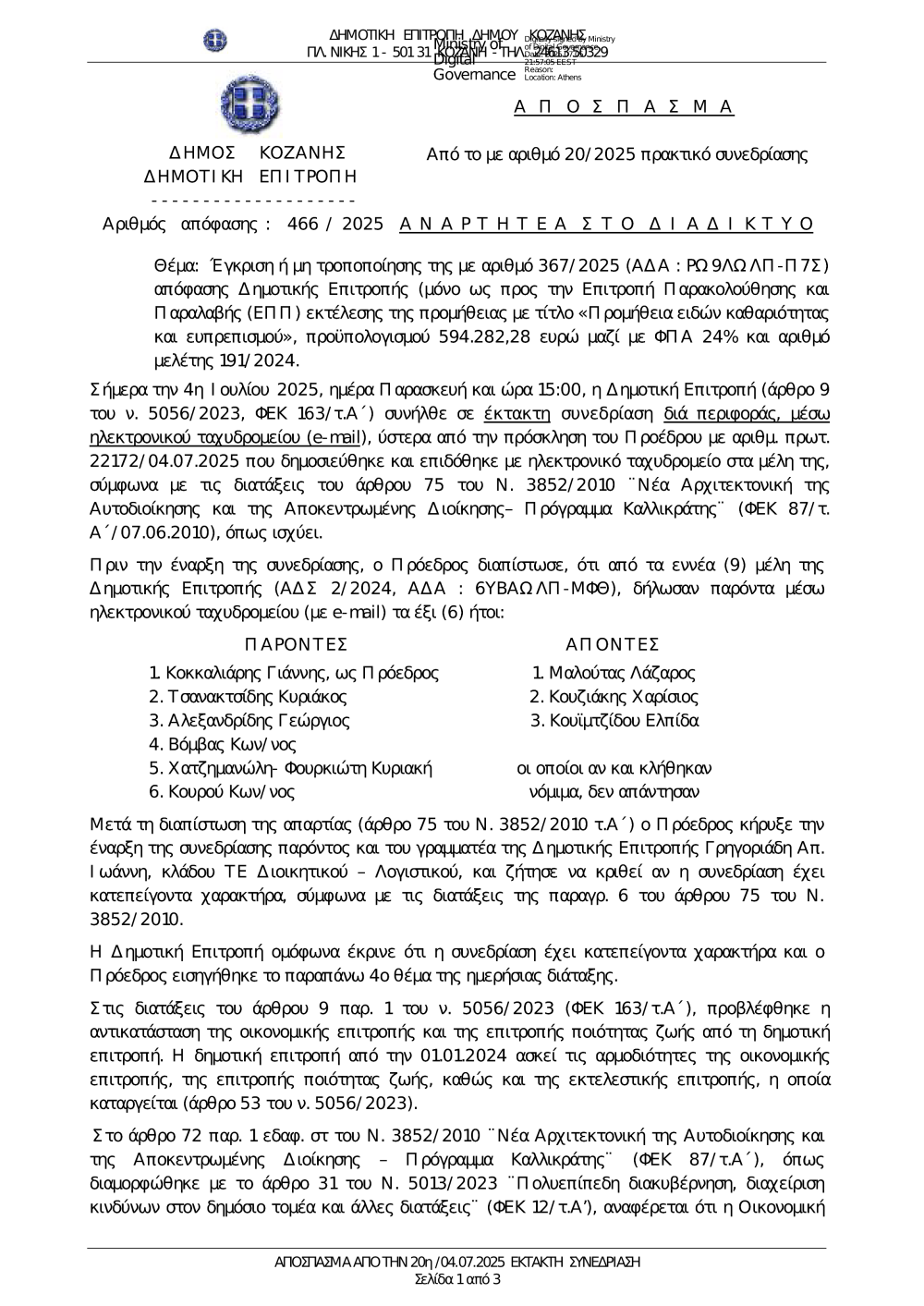 466-2025 Τροποποίηση της 367-2025 ΑΔΕ για την Επιτροπής Παρακολούθησης & Παραλαβής για Προμήθεια Υλικών Καθαριότητας.pdf (Έκδοση 1.0)
