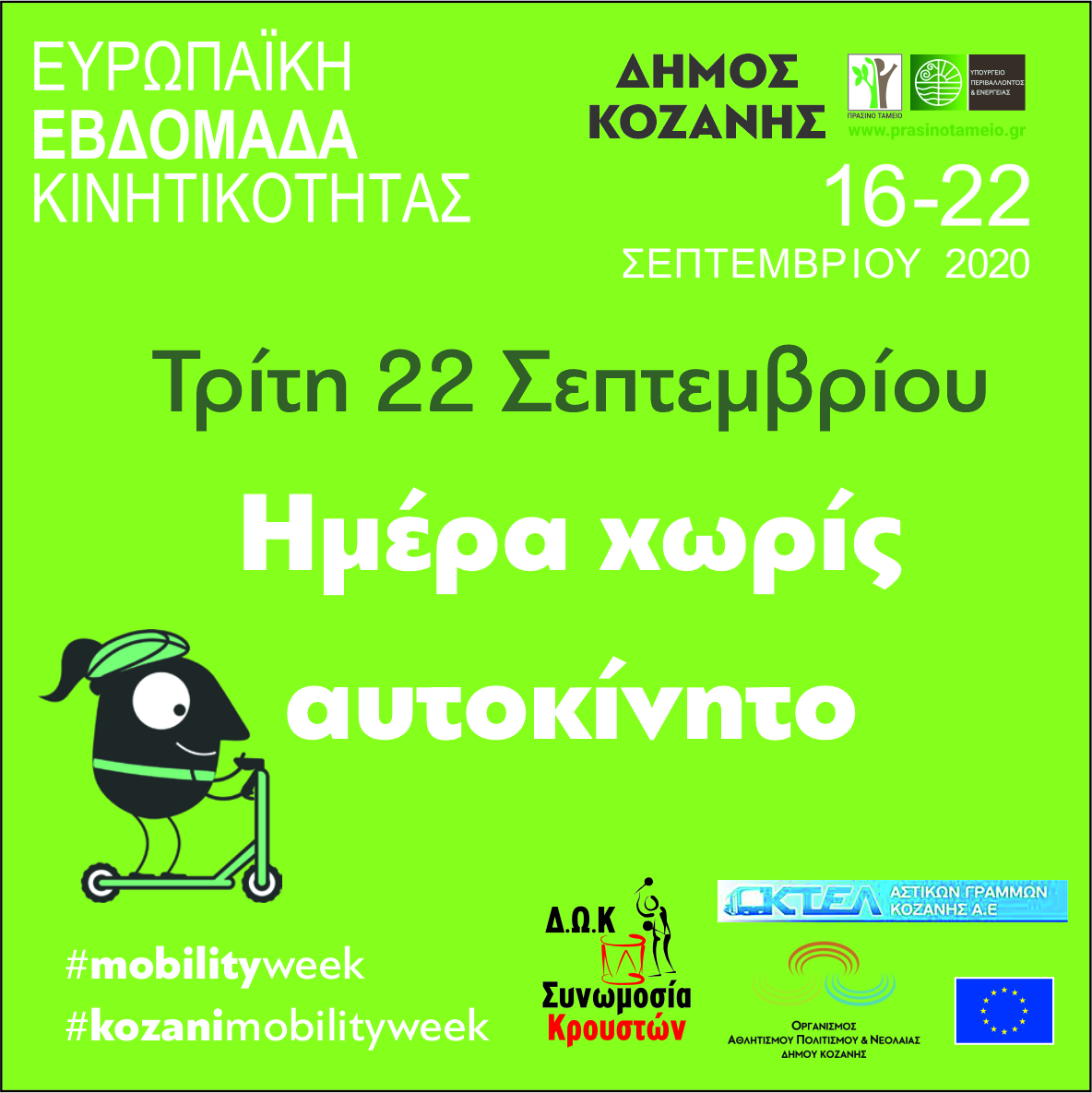 Η τήρηση των μέτρων κοινωνικής αποστασιοποίησης δεν επιτρέπει φέτος την πραγματοποίηση της πανηγυρικής Τελετής Λήξης της Ευρωπαϊκής Εβδομάδας Κινητικότητας στην Πλατεία Νίκης. Για το λόγο αυτό θα μεταδοθεί βιντεοσκοπημένη, στις 20.30 μέσα από το κανάλι του Δήμου Κοζάνης στο youtube. Γυμναστήρια της πόλης χορεύουν στο Υπαίθριο Δημοτικό Θέατρο στους ρυθμούς της Ευρωπαϊκής Εβδομάδας Κινητικότητας και της Ημέρας Χωρίς Αυτοκίνητο, υπό το συντονισμό του youtuber Τόλη Τσιρούδη.