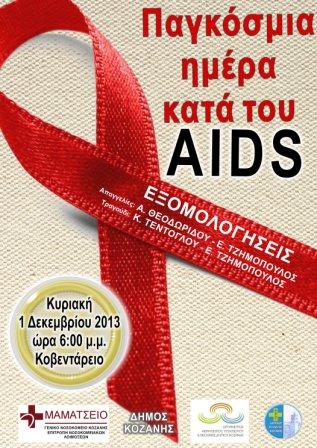 Με αφορμή την Παγκόσμια Ημέρα κατά του AIDS, το Γενικό Νοσοκομείο «ΜΑΜΑΤΣΕΙΟ-ΜΠΟΔΟΣΑΚΕΙΟ» Φορέας Ν. Κοζάνης, ο Δήμος Κοζάνης, ο Ιατρικός Σύλλογος και ο Οργανισμος Αθλητισμού-Πολιτισμού και Νεολαίας του Δήμου Κοζάνης, σας προσκαλούν στην εκδήλωση που διοργανώνουν: