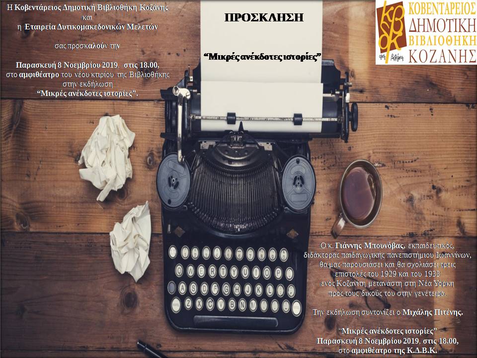 Μικρές ανέκδοτες ιστορίες” είναι ο τίτλος της νέας σειράς εκδηλώσεων που οργανώνει η Κοβεντάρειος Δημοτική Βιβλιοθήκη Κοζάνης σε συνεργασία με την Εταιρεία Δυτικομακεδονικών Μελετών.