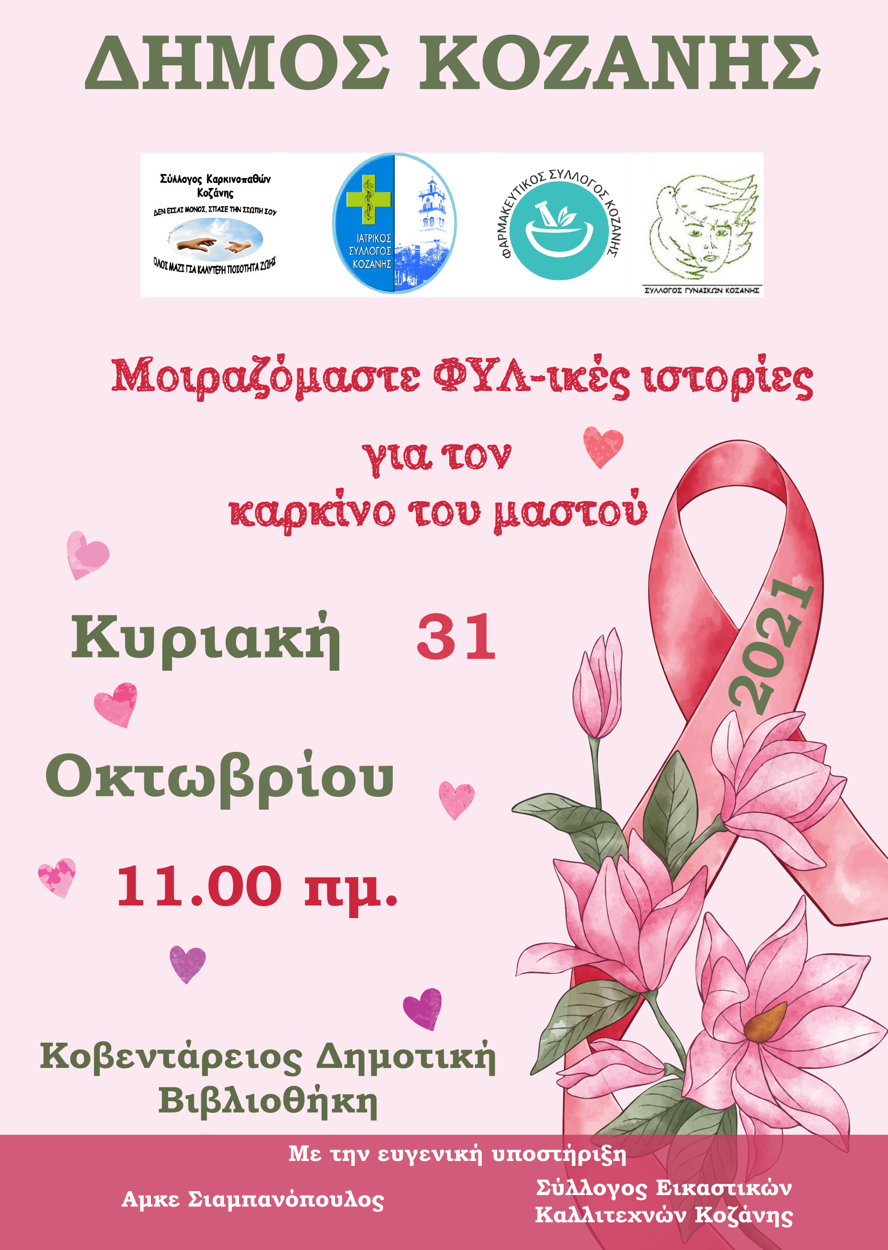 Ο Δήμος Κοζάνης συνεχίζει τις δράσεις ευαισθητοποίησης και ενημέρωσης για την πρόληψη και την έγκαιρη διάγνωση του καρκίνου του μαστού. Σε αυτό το πλαίσιο, «Μοιραζόμαστε ΦΥΛ-ικές ιστορίες για τον καρκίνο του μαστού», την Κυριακή 31 Οκτωβρίου 2021, στον χώρο της Κοβενταρείου Δημοτικής Βιβλιοθήκης Κοζάνης, στις 11 το πρωί.