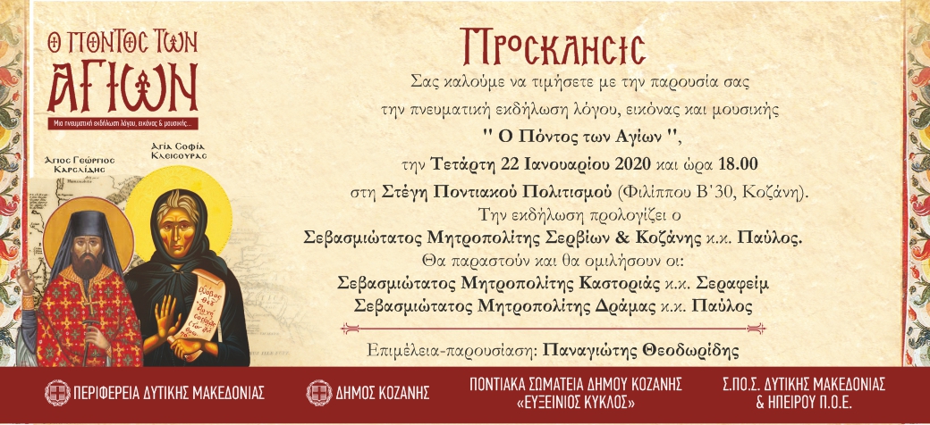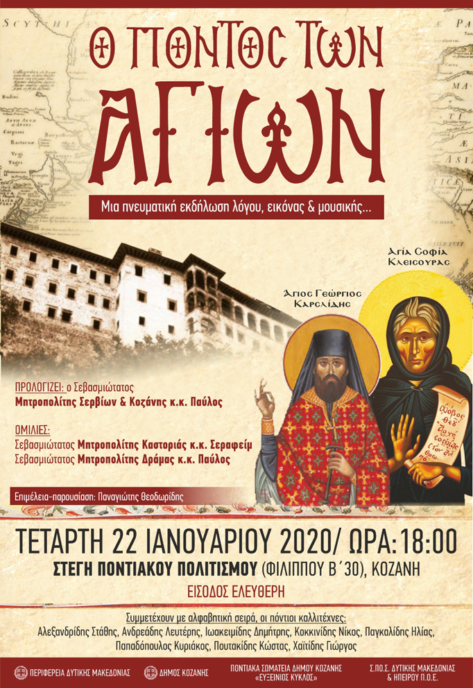 Μια πνευματική εκδήλωση, λόγου, εικόνας και μουσικής, θα λάβει χώρα την Τετάρτη 22 Ιανουαρίου 2020 και ώρα 18.00, στη Στέγη Ποντιακού Πολιτισμού (Φιλίππου Β´ 30, Κοζάνη), με ελεύθερη είσοδο για το κοινό.