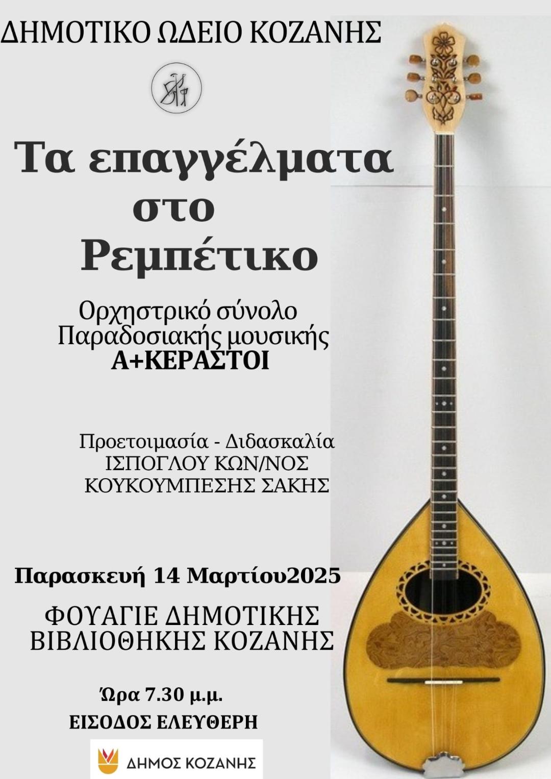 «Τα Επαγγέλματα στο Ρεμπέτικο» από το Δημοτικό Ωδείο Κοζάνης την Παρασκευή 14 Μαρτίου 2025 στο Φουαγιέ της Δημοτικής Βιβλιοθήκης με ώρα έναρξης στις 19:30 το απόγευμα – Είσοδος Ελεύθερη – Σας περιμένουμε!