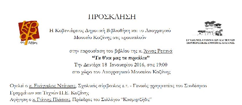 Η Κοβεντάρειος Δημοτική Βιβλιοθήκη Κοζάνης σε συνεργασία με τον Σύνδεσμο Γραμμάτων και Τεχνών Ν. Κοζάνης, παρουσιάζουντο βιβλίο της κ. Άννας Ρεπανά “Τα θ'κα μας τα πιρκάλια”, την Δευτέρα 18 Ιανουαρίου 2016, στο Ιστορικό – Λαογραφικό & Φυσικής Ιστορίας Μουσείο Κοζάνης, στις 7:00 μμ.