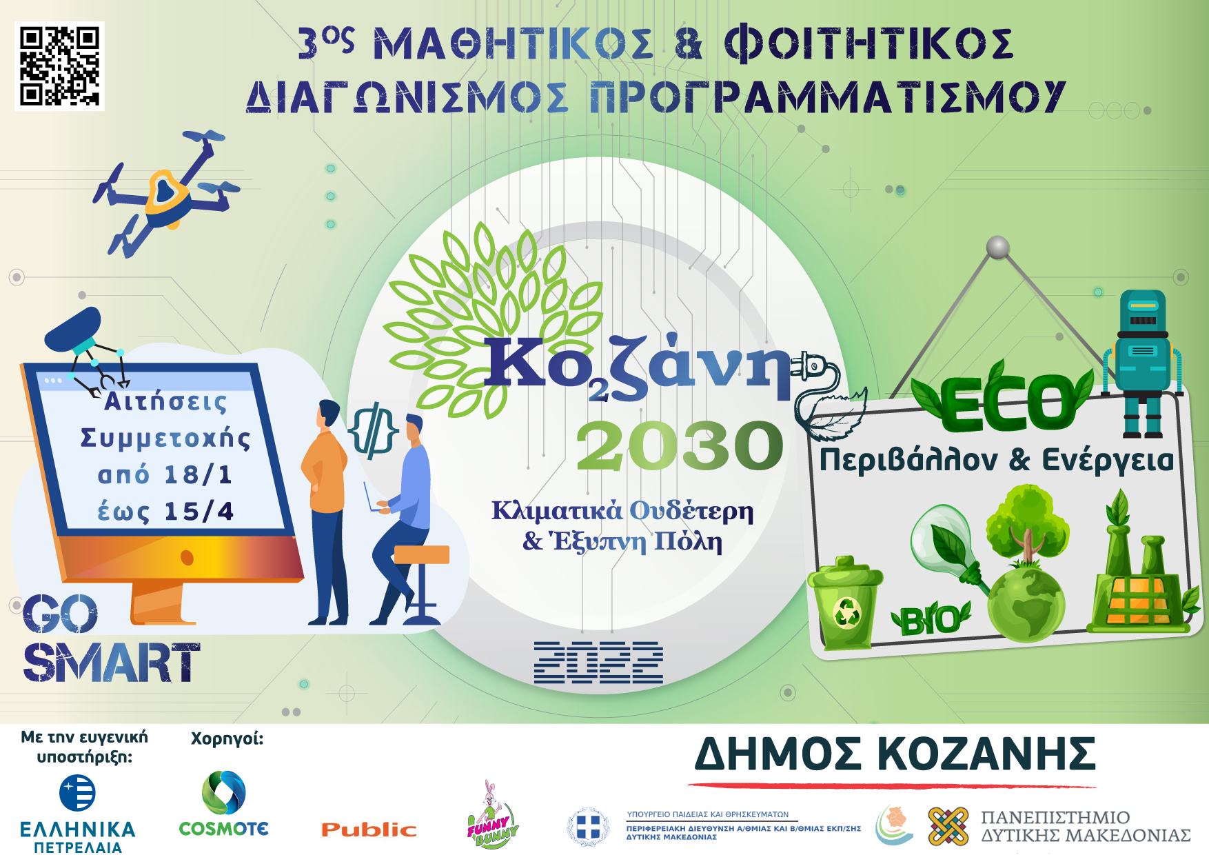 3ος Μαθητικός & Φοιτητικός Διαγωνισμός Προγραμματισμού «Κοζάνη 2030: Κλιματικά ουδέτερη και έξυπνη πόλη» - Άξονας «Περιβάλλον και Ενέργεια»