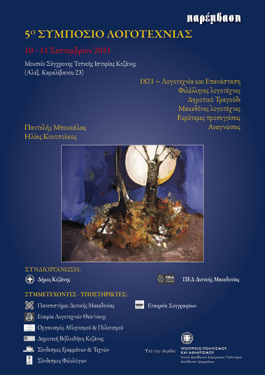 Το Λογοτεχνικό Περιοδικό «Παρέμβαση», σε συνδιοργάνωση με τον Δήμο Κοζάνης και την ΠΕΔ Δυτικής Μακεδονίας, διοργανώνει κατά το διήμερο 10 & 11 Σεπτεμβρίου 2021 το 5ο Συμπόσιο Λογοτεχνίας.