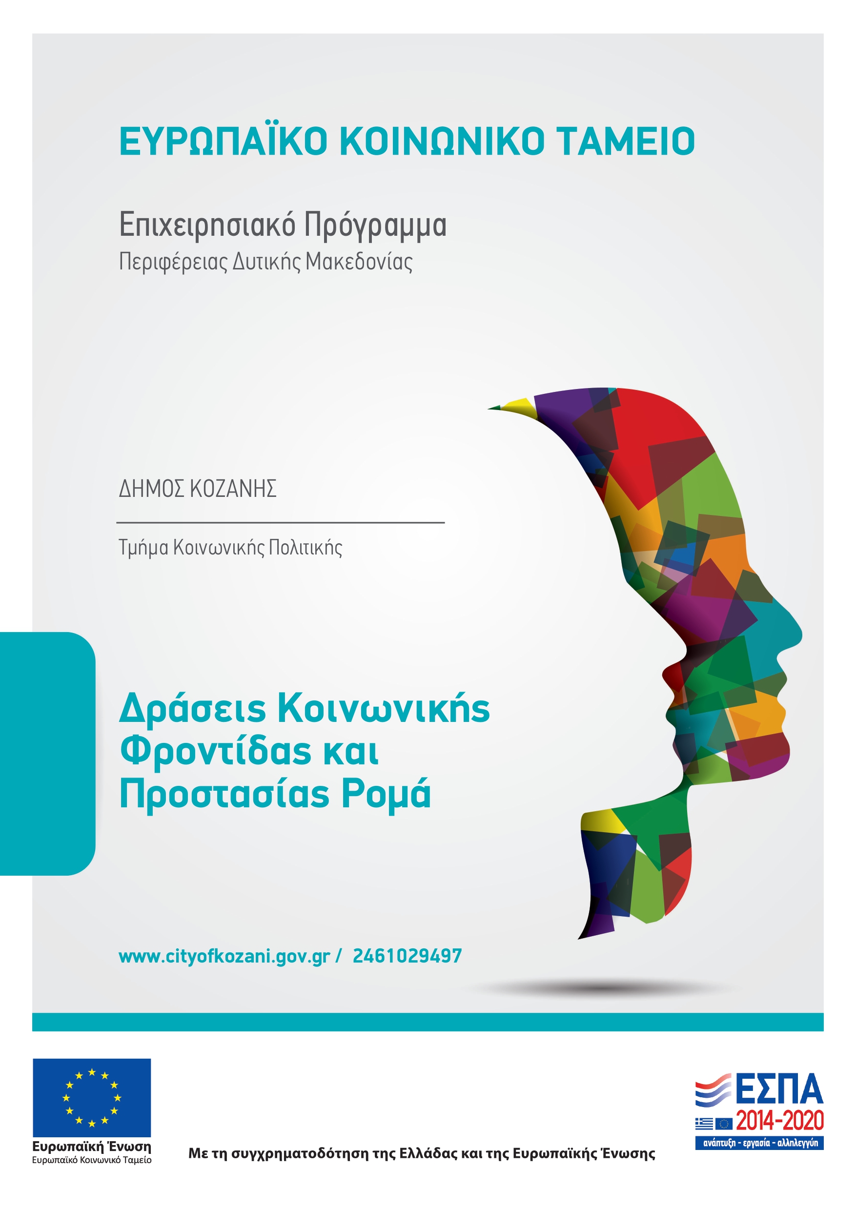 Οι «Δράσεις Κοινωνικής Φροντίδας και προστασίας Ρομά/επιδότηση ενοικίου Δήμου Κοζάνης», έχουν χρονική περίοδο υλοποίησης από 01/01/2021 έως 31/12/2023, υλοποιούνται με τη συγχρηματοδότηση του Ευρωπαϊκού Κοινωνικού Ταμείου (ΕΚΤ) και Εθνικών Πόρων, μέσω του Άξονα Προτεραιότητας 10: «Προώθηση της κοινωνικής ένταξης και καταπολέμηση της φτώχειας και κάθε διάκρισης (ΕΚΤ)», του Επιχειρησιακού Προγράμματος Περιφέρειας Δυτικής Μακεδονίας 2014-2020.
