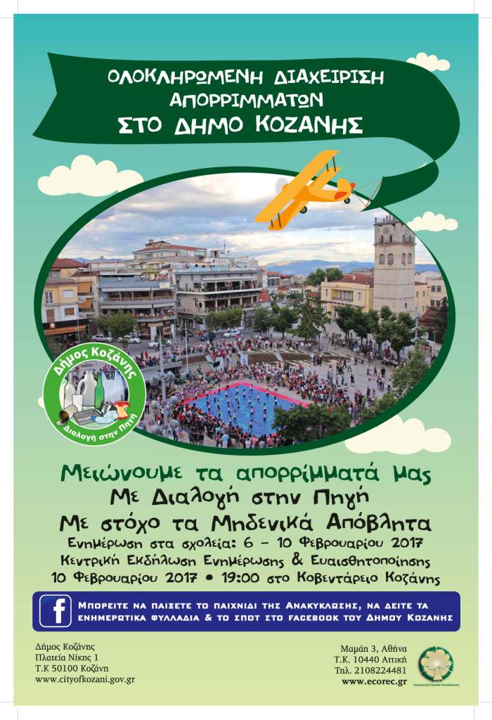 Η Αντιδημαρχία Περιβάλλοντος του Δήμου Κοζάνης, στο πλαίσιο της ενημέρωσης για την Ολοκληρωμένη Διαχείριση Απορριμμάτων, θα υλοποιήσει από 6-10 Φεβρουαρίου 2017, πρόγραμμα ενημέρωσης και ευαισθητοποίησης μαθητών α/βάθμιας και β/βάθμιας εκπαίδευσης σε 27 σχολικές μονάδες του Δήμου μας στην προώθηση της Διαλογής στην Πηγή (ΔσΠ) των ανακυκλώσιμων υλικών και των βιοαποβλήτων.