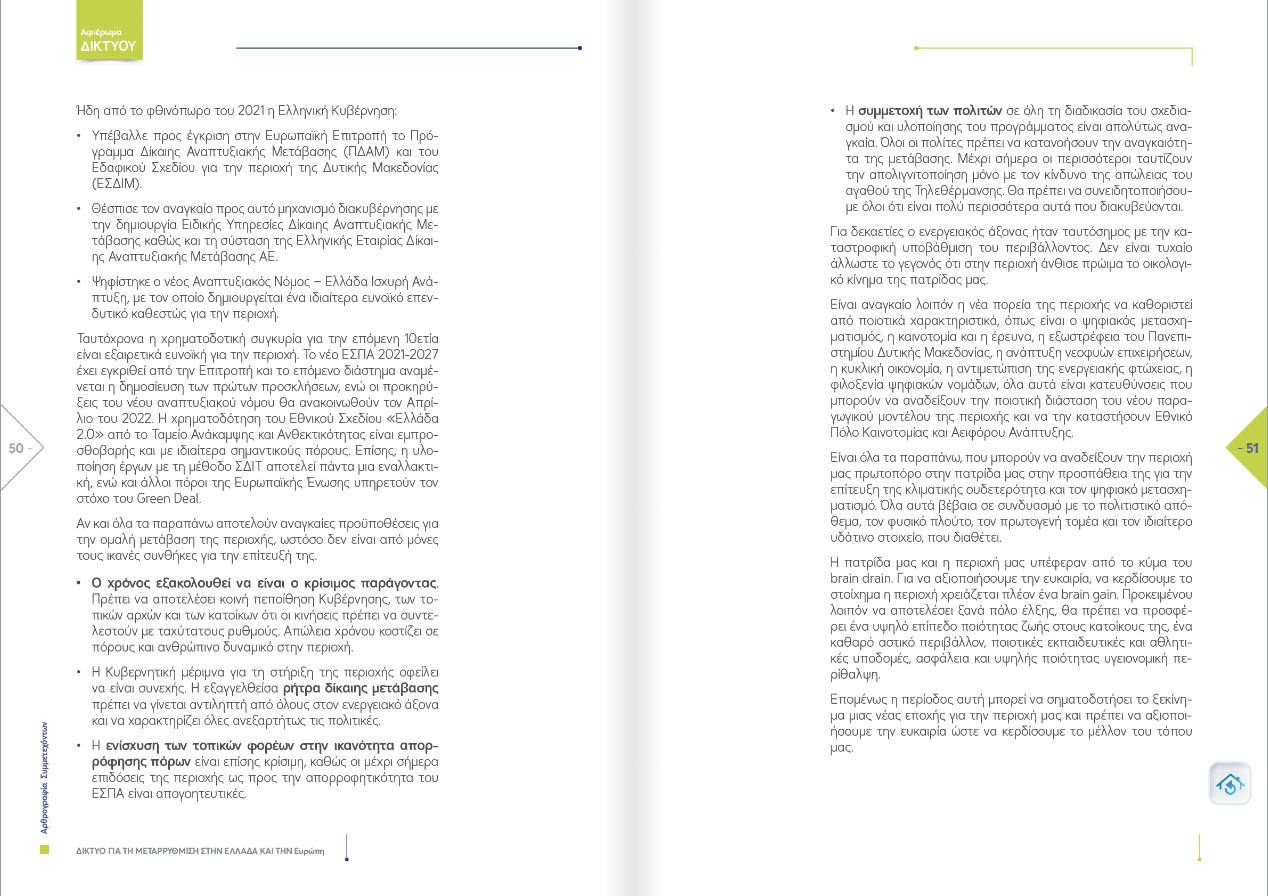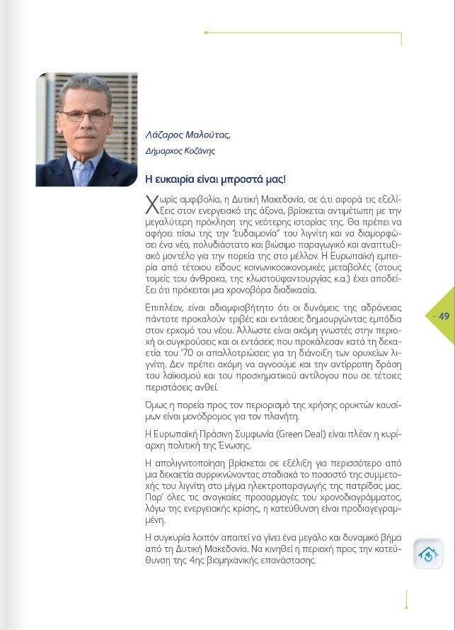 «Η ευκαιρία είναι μπροστά μας!» είναι ο τίτλος του άρθρου του δημάρχου Κοζάνης, Λάζαρου Μαλούτα, στο αφιέρωμα του ΔΙΚΤΥΟΥ για τη Μεταρρύθμιση στην Ελλάδα και την Ευρώπη, για τον «Ενεργειακό και ψηφιακό μετασχηματισμό ως πυλώνες της «Δίκαιης Μετάβασης» των λιγνιτικών περιοχών».