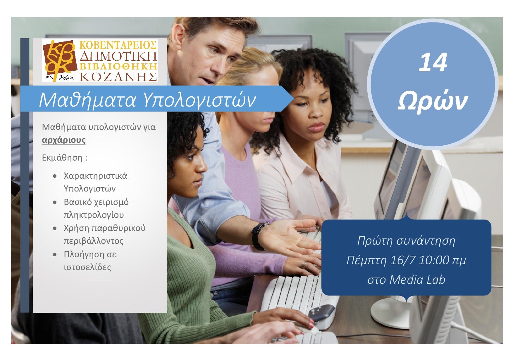 Η Κοβεντάρειος Δημοτική Βιβλιοθήκη Κοζάνης θα πραγματοποιήσει μαθήματα ηλεκτρονικών υπολογιστών για αρχάριους, 12 ατόμων (ο αριθμός των συμμετεχόντων μπορεί να αυξηθεί αν κάποιος φέρει το δικό του laptop). Τα σεμινάρια θα έχουν διάρκεια 14 ώρες και θα πραγματοποιηθούν από 20 έως 28 Ιουλίου, από Δευτέρα - Παρασκευή 10:00΄- 11:30΄, στο χώρο του media lab της βιβλιοθήκης. Την Εκπαίδευση στις βασικές δεξιότητες Η/Υ (χαρακτηριστικά υπολογιστών, βασικό χειρισμό πληκτρολογίου, χρήση παραθυρικού περιβάλλοντος, πλοήγηση σε ιστοσελίδες) θα πραγματοποιήσει ο κ. Δημήτρης Ντούλας, τεχνικός Η/Υ και δικτύων.