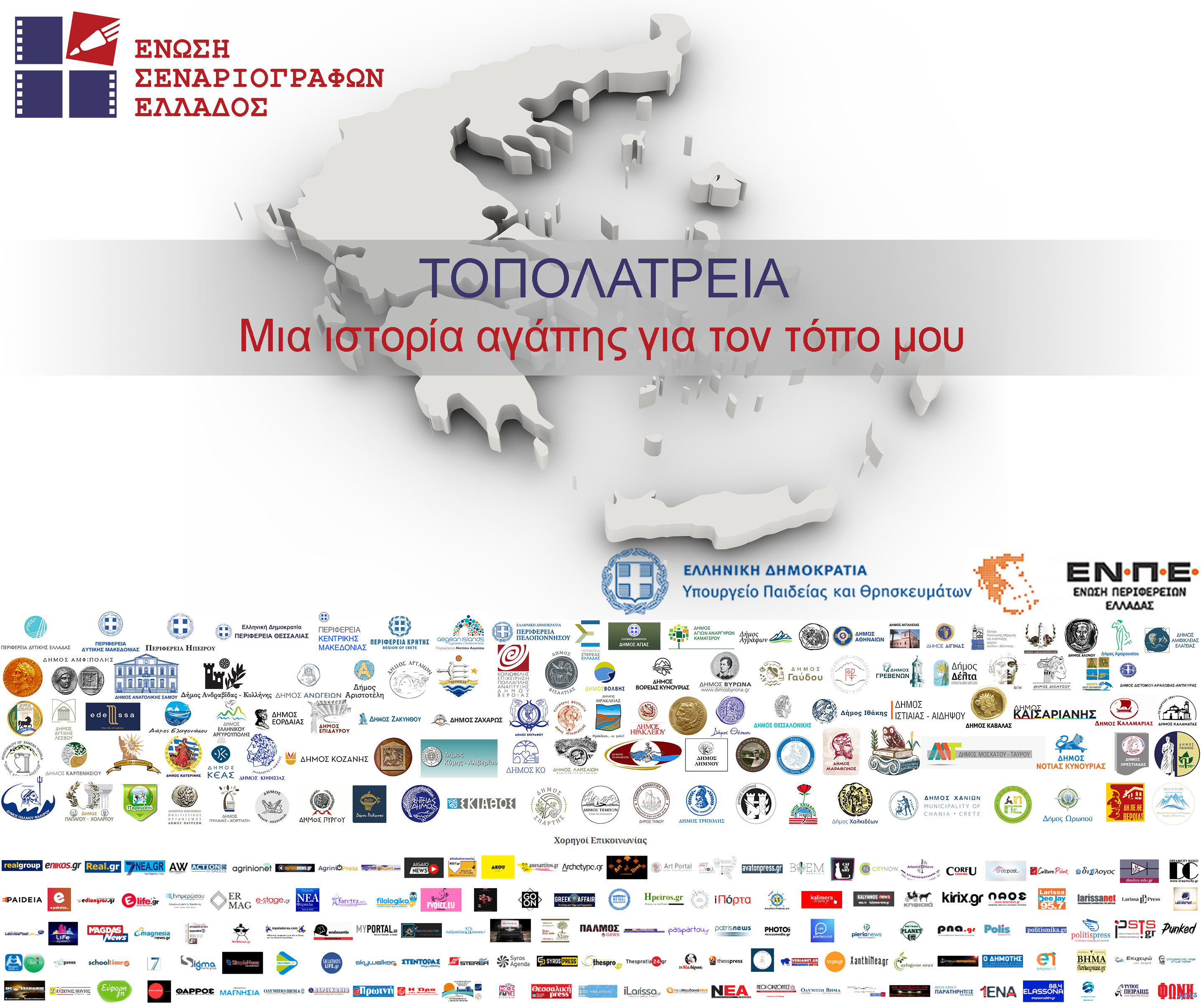 Εάν πιστεύετε ότι μπορείτε με τρεις φωτογραφίες, ακόμα και του κινητού σας, να πείσετε μια επιτροπή δημιουργών ότι η δική σας αγάπη προβάλλει πειστικότερα, καλλίτερα και εντυπωσιακότερα τον τόπο σας τότε έχετε πολλές πιθανότητες να είσθε εκείνος ή εκείνη που θα κληθεί να δημιουργήσει, δηλαδή να γράψει το πλήρες σενάριο και να σκηνοθετήσει ένα promo (διαφημιστικό 3΄λεπτης διάρκειας) σε παραγωγή της Ένωσης Σεναριογράφων Ελλάδος, με τίτλο ΤΟΠΟΛΑΤΡΕΙΑ ώστε να αναδειχθεί η ιδιαιτερότητα του τόπου και η μεγάλη αγάπη για αυτόν.