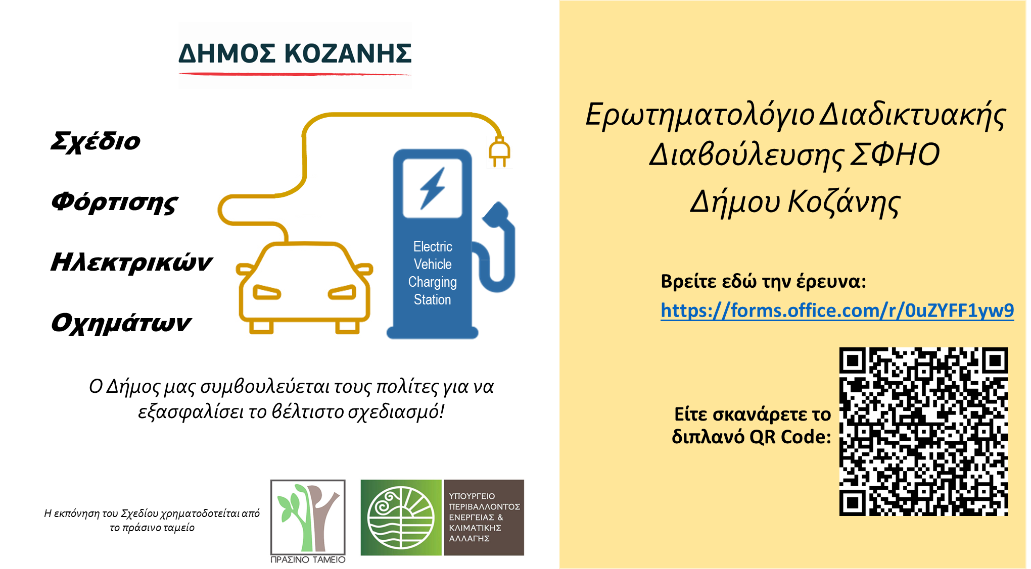 Ο Δήμος Κοζάνης εναρμονιζόμενος με τις εθνικές επιταγές για την προώθηση των "καθαρών" μορφών μετακίνησης, εκπονεί το Σχέδιο Φόρτισης Ηλεκτρικών Οχημάτων για την περιοχή αρμοδιότητάς του.
