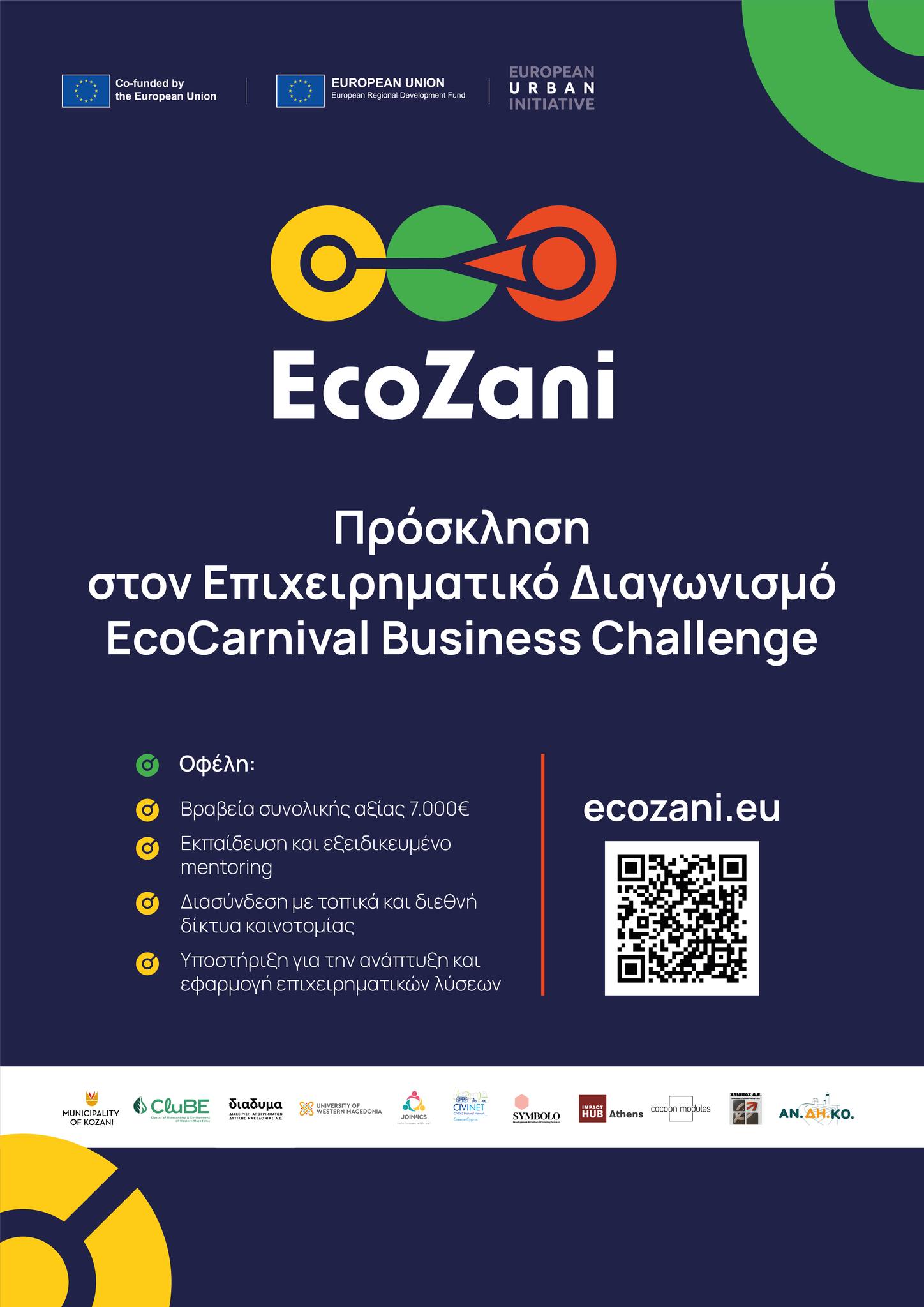 Ο Δήμος Κοζάνης, ως συντονιστής του έργου EcoZani, σε συνεργασία με το CluBE, το Πανεπιστήμιο Δυτικής Μακεδονίας, την JOIN4CS και την Impact Hub Labs, ανακοινώνει την παράταση της προθεσμίας υποβολής αιτήσεων για τον 1ο Επιχειρηματικό Διαγωνισμό EcoCarnival Business Challenge.