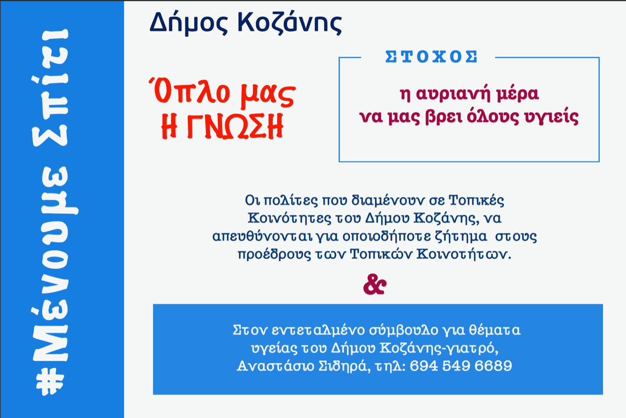 Παρακαλούνται οι πολίτες που διαμένουν σε Τοπικές Κοινότητες του Δήμου Κοζάνης, να απευθύνονται για οποιοδήποτε ζήτημα που αφορά στην πανδημία του κορωνοϊού στους προέδρους των Τοπικών Κοινοτήτων, καθώς και στον εντεταλμένο σύμβουλο για θέματα υγείας του Δήμου Κοζάνης-γιατρό, Αναστάσιο Σιδηρά, στο τηλέφωνο 694 549 6689.