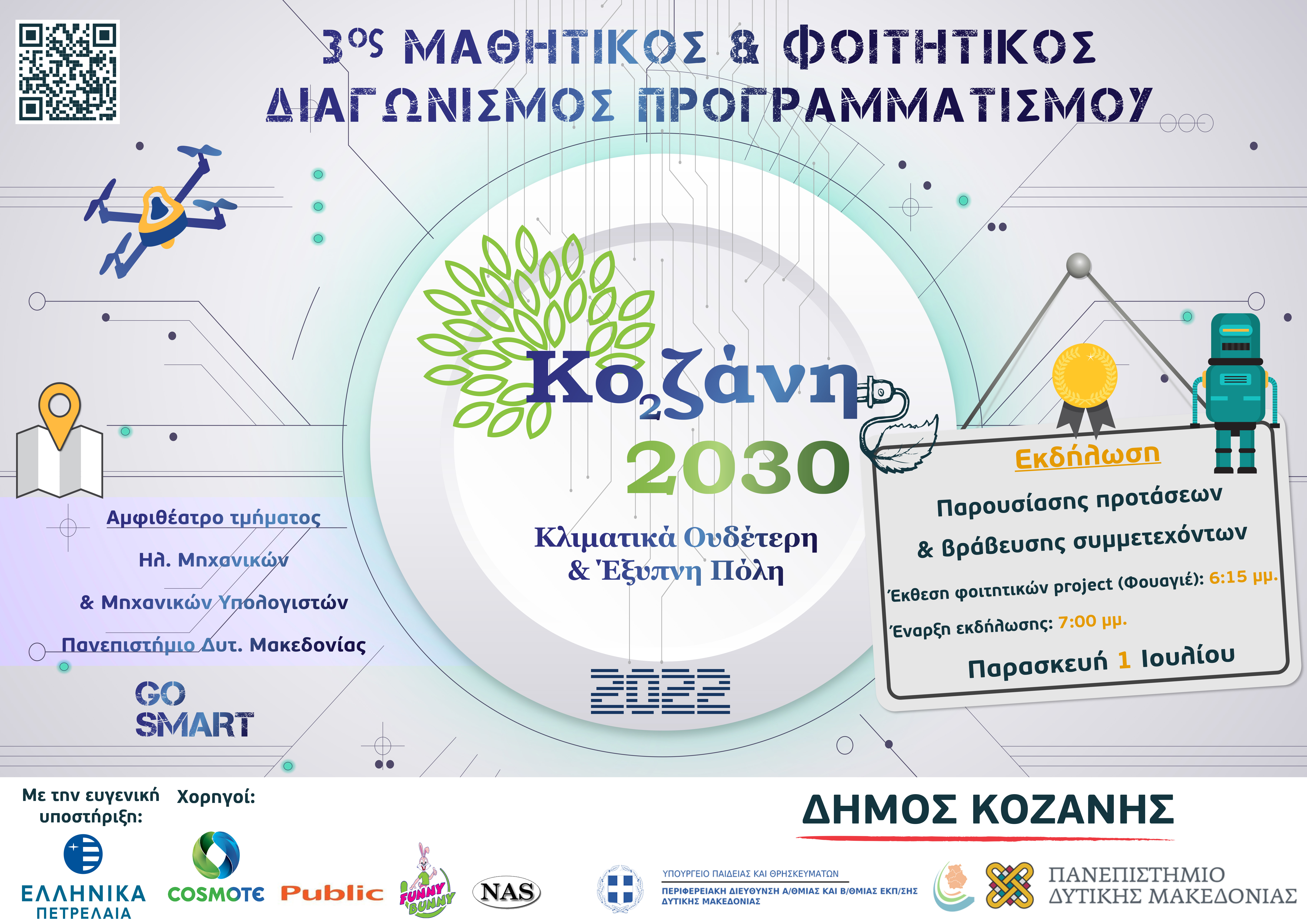 Ο Μαθητικός & Φοιτητικός Διαγωνισμός Προγραμματισμού με θέμα «Κοζάνη 2030: Κλιματικά ουδέτερη και έξυπνη πόλη», που διοργανώθηκε φέτος για 3η συνεχόμενη χρονιά από τον Δήμο Κοζάνης, την Περιφερειακή Διεύθυνση Εκπαίδευσης Δυτικής Μακεδονίας και το Τμήμα Ηλεκτρολόγων Μηχανικών & Μηχανικών Υπολογιστών του Πανεπιστημίου Δυτικής Μακεδονίας, ολοκληρώθηκε.