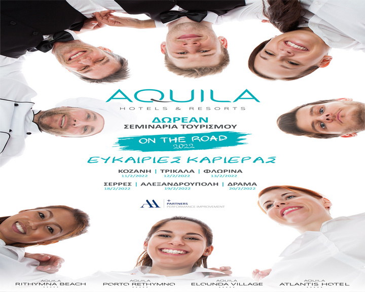 Μετά την μεγάλη επιτυχία του πρώτου “AQUILA on the Road 2020”, ο Όμιλος ξενοδοχείων AQUILA Hotels & Resorts σε συνεργασία με την εταιρία εκπαίδευσης και διαχείρισης Ανθρώπινου Δυναμικού AA+Partners, διοργανώνει το “Aquila on the Road 2022” σε έξι πόλεις της Β. Ελλάδος. Στο πλαίσιο της διοργάνωσης, θα πραγματοποιηθεί ενημερωτική εκδήλωση στις 11/2/2022 στην “Κοβεντάρειο” Δημοτική Βιβλιοθήκη Κοζάνης για όσους ενδιαφέρονται να δραστηριοποιηθούν επαγγελματικά στον τομέα του τουρισμού. Η εκδήλωση θα ξεκινήσει στις 15:30.