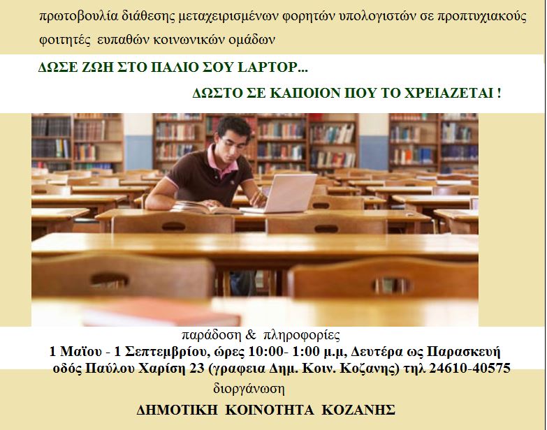 Η Δημοτική κοινότητα Κοζάνης έχει αναλάβει την πρωτοβουλία διάθεσης μεταχειρισμένων φορητών υπολογιστών σε προπτυχιακούς φοιτητές οικογενειών που ανήκουν σε ευπαθείς κοινωνικές ομάδες της περιοχής μας.