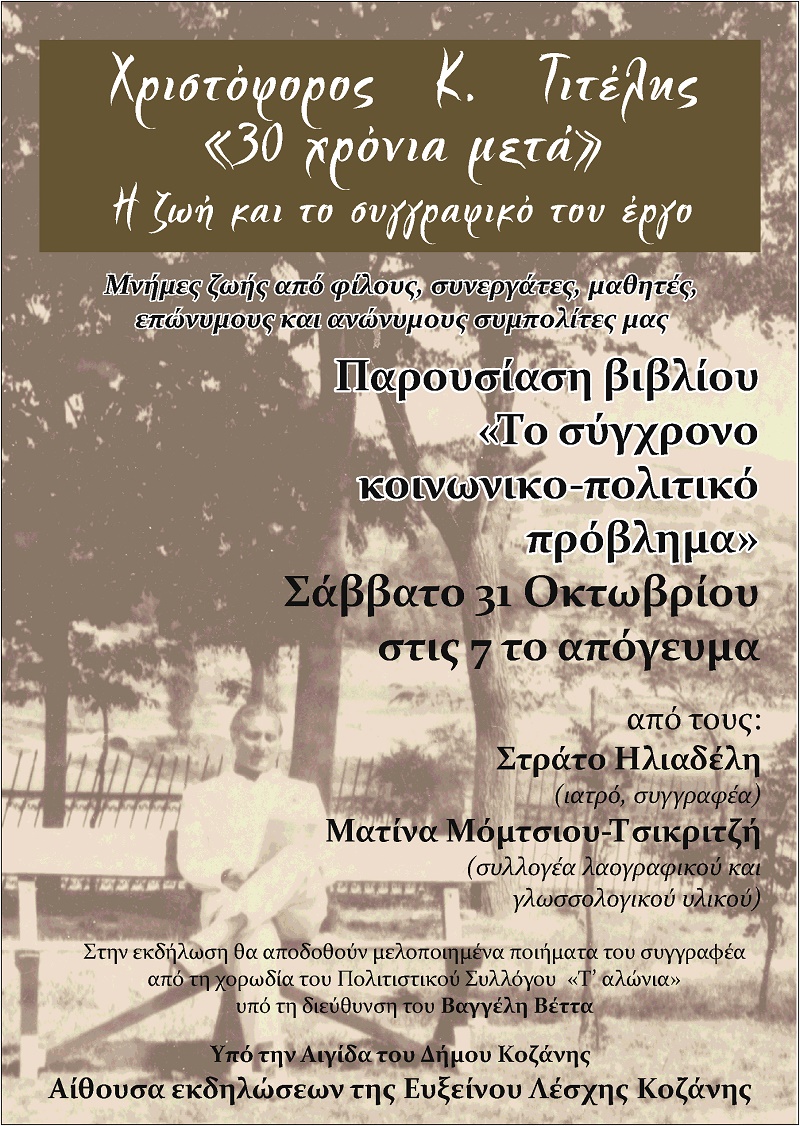 Εκδήλωση- αφιέρωμα στη ζωή και το συγγραφικό έργο του αείμνηστου Κοζανίτη εκπαιδευτικού Χριστόφορου Κ. Τιτέλη, τριάντα χρόνια μετά το θάνατο του, θα πραγματοποιηθεί το Σάββατο 31 Οκτωβρίου 2015, στις 7 το απόγευμα στην αίθουσα της Ευξείνου Λέσχης Κοζάνης. Κατά τη διάρκεια της εκδήλωσης θα παρουσιαστεί το βιβλίο του με τίτλο "Το σύγχρονο κοινωνικό- πολιτικό πρόβλημα",