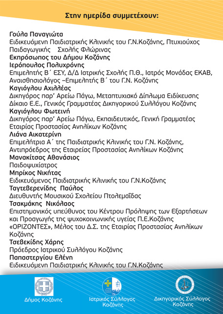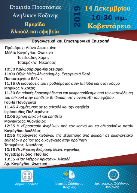 Η Εταιρεία Προστασίας Ανηλίκων Κοζάνης με την υποστήριξη του Δήμου Κοζάνης, του Ιατρικού Συλλόγου Κοζάνης και του Δικηγορικού Συλλόγου Κοζάνης διοργανώνουν ημερίδα με τίτλο «Αλκοόλ και εφηβεία», το Σάββατο 14 Δεκεμβρίου, στις 10.30 π.μ. στην αίθουσα του Κοβεντάρειου.