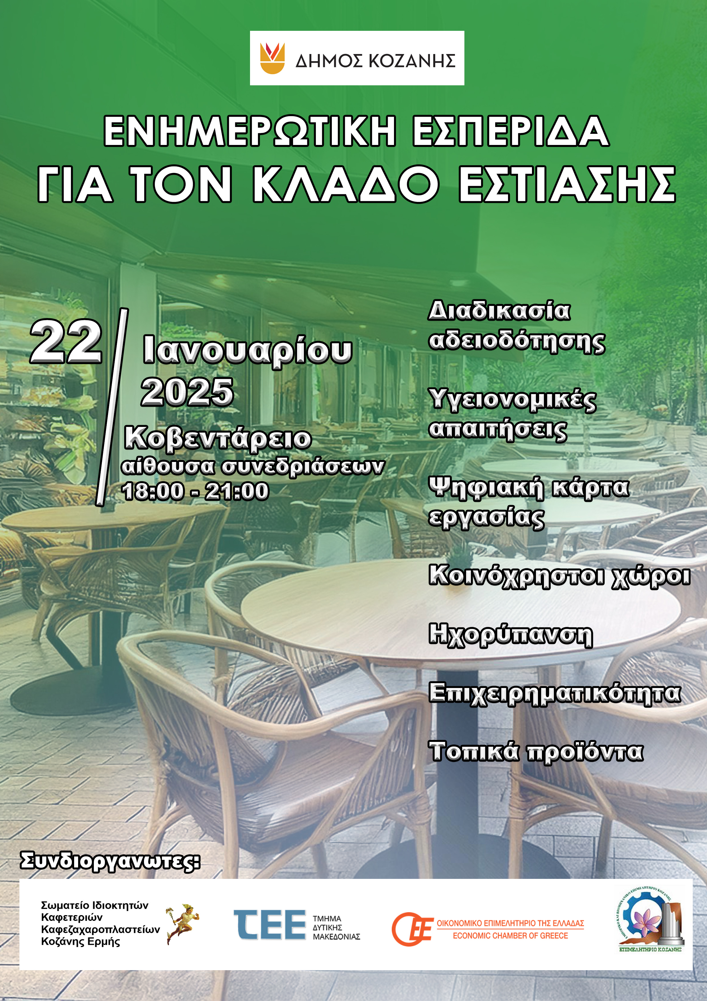Ενημερωτική Εσπερίδα του Δήμου Κοζάνης για τον Κλάδο Εστίασης την Τετάρτη 22 Ιανουαρίου 2025 και ώρα 18:00 στην Αίθουσα Κοβεντάρειο