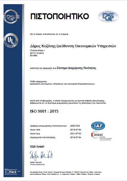 Το πιστοποιητικό ISO εγκαινιάζει μια νέα φιλοσοφία διοίκησης των δημοτικών υπηρεσιών και διαχείρισης του δημόσιου χρήματος και μια νέα εποχή για την Οικονομική Υπηρεσία του Δήμου Κοζάνης.