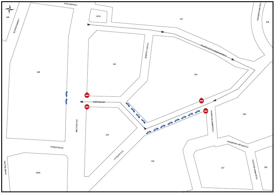 1. Τη προσωρινή μονοδρόμηση της οδού Ιπποκράτους και της οδού Εθελοντών με κατεύθυνση από την οδό Κωνσταντίνου Παλαιολόγου προς την οδό Παύλου Μελά.