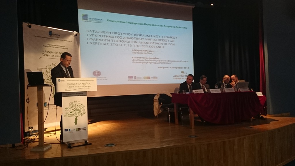 Για τα έργα του Δήμου Κοζάνης που έχουν ενταχθεί στο Επιχειρησιακό Πρόγραμμα Περιβάλλον - Αειφόρος Ανάπτυξη, μίλησε ο Δήμαρχος Κοζάνης Λάζαρος Μαλούτας, σε ημερίδα που πραγματοποιήθηκε στη Φλώρινα με θέμα : «Προβολή των έργων του ΕΠΠΕΡΑΑ στην Περιφέρεια Δυτικής Μακεδονίας. Νέες ευκαιρίες για τις χρηματοδοτικές δυνατότητες της Περιφέρειας στην Προγραμματική Περίοδο 2014-2020″, ενώ πραγματοποιήθηκε και αναλυτική παρουσίαση της κατασκευής του Πρότυπου Βιοκλιματικού Σχολικού Συγκροτήματος Δημοτικού-Νηπιαγωγείου με εφαρμογή Τεχνολογιών Ανανεώσιμων Πηγών Ενέργειας, που υλοποείται στη ΖΕΠ Κοζάνης.