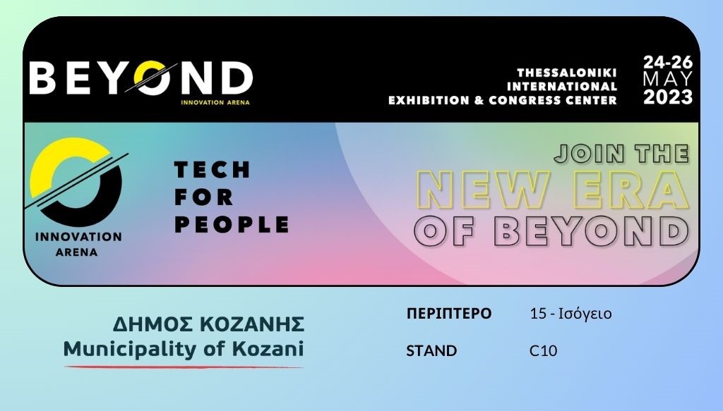 Ο Δήμος Κοζάνης συμμετέχει στην 3η Διεθνή Έκθεση Καινοτομίας, Επιχειρηματικότητας & Τεχνολογίας «BEYOND», που θα πραγματοποιηθεί από την Τετάρτη 24 έως την Παρασκευή 26 Μαΐου 2023, στο χώρο του Διεθνούς Εκθεσιακού και Συνεδριακού Κέντρου Θεσσαλονίκης (Δ.Ε.Θ. – HELEXPO Α.Ε.).