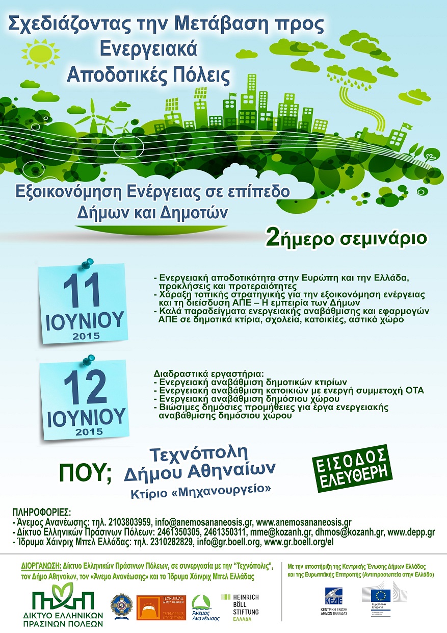 Το σεμινάριο διοργανώνεται από το Δίκτυο Ελληνικών Πράσινων Πόλεων (ΔΕΠΠ), στην προεδρία του οποίου είναι η Κοζάνη, σε συνεργασία με τον Δήμο Αθηναίων, την Τεχνόπολη Δήμου Αθηναίων, την ΚΟΙΝ.Σ.ΕΠ. «Άνεμος Ανανέωσης» και το Ίδρυμα Χάινριχ Μπελ Ελλάδας. Οι διήμερες εκδηλώσεις θα διεξαχθούν 11 και 12 Ιουνίου 2015, στην Τεχνόπολη Δήμου Αθηναίων, αίθουσα «Μηχανουργείο» και έχουν την υποστήριξη της Κεντρικής Ένωσης Δήμων Ελλάδος (ΚΕΔΕ) και της Αντιπροσωπείας της Ευρωπαϊκής Επιτροπής στην Ελλάδα.