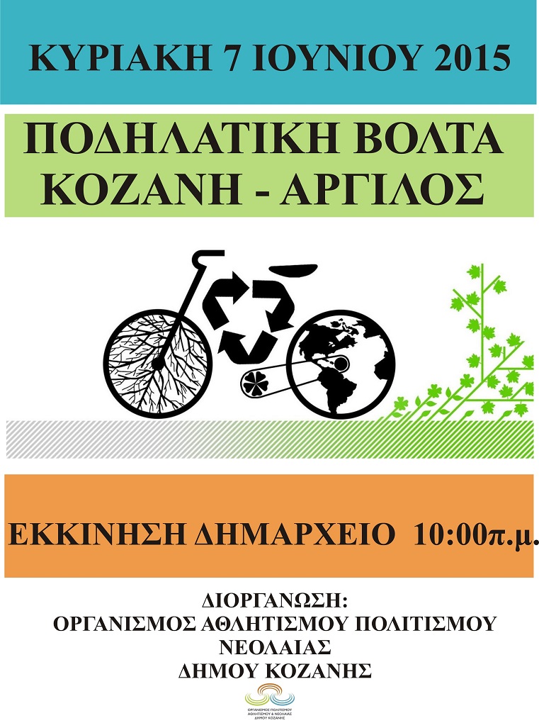 Με αφορμή την παγκόσμια ημέρα περιβάλλοντος και με στόχο την ευαισθητοποίηση των πολιτών και κυρίως των μικρών μαθητών σε θέματα χρήσης των ήπιων μέσων μετακίνησης μέσα στην πόλη και στην εξοχή, ο Οργανισμός Αθλητισμού Πολιτισμού & Νεολαίας του Δήμου Κοζάνης διοργανώνει ποδηλατική πορεία στις 10 το πρωί της Κυριακής 7 Ιουνίου.