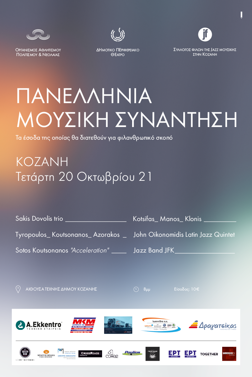 Ο Σύλλογος Φίλων της Τζαζ στην Κοζάνη και ο Δήμος Κοζάνης ΟΑΠΝ, σε συνεργασία με το ΔΗΠΕΘΕ Κοζάνης, διοργανώνουν Πανελλήνια Μουσική Συνάντηση στις 20 Οκτωβρίου 2021στην Κοζάνη με την συμμετοχή έξι μουσικών σχημάτων και περισσότερων από 20 μουσικών από Κοζάνη, Θεσσαλονίκη, Λάρισα, Αθήνα και Κρήτη. Η διοργάνωση θα ξεκινήσει στις 20.00 στην Αίθουσα Τέχνης της πόλης και όλα τα έσοδα θα διατεθούν για φιλανθρωπικό σκοπό.