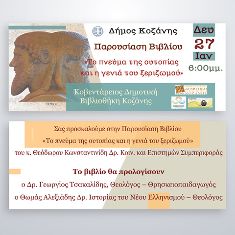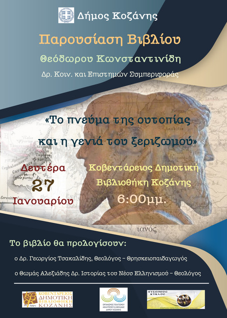 Ο Δήμος Κοζάνης και τα Ποντιακά Σωματεία του Δήμου Κοζάνης σας προσκαλούν στην παρουσίαση του βιβλίου «Το πνεύμα της ουτοπίας και η γενιά του ξεριζωμού», του κ. Θεόδωρου Κωνσταντινίδη, Δρ. Κοιν. και Επιστημών Συμπεριφοράς, τη Δευτέρα 27 Ιανουαρίου, στις 18:00, στην Κοβεντάρειο Δημοτική Βιβλιοθήκη Κοζάνης.