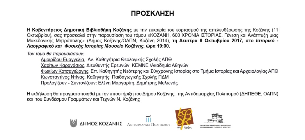 Η Κοβεντάρειος Δημοτική Βιβλιοθήκη Κοζάνης με την ευκαιρία του εορτασμού της απελευθέρωσης της Kοζάνης (11 Οκτωβρίου), σας προσκαλεί στην παρουσίαση του τόμου «ΚΟΖΑΝΗ, 600 ΧΡΟΝΙΑ ΙΣΤΟΡΙΑΣ. Γένεση και Ανάπτυξη μιας Μακεδονικής Μητρόπολης» (Δήμος Κοζάνης/ΟΑΠΝ, Κοζάνη 2014), τη Δευτέρα 9 Οκτωβρίου 2017, στο Ιστορικό - Λαογραφικό και Φυσικής Ιστορίας Μουσείο Κοζάνης, ώρα 19:00.