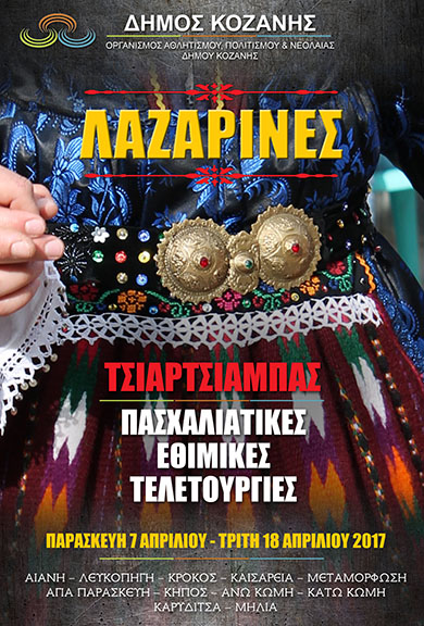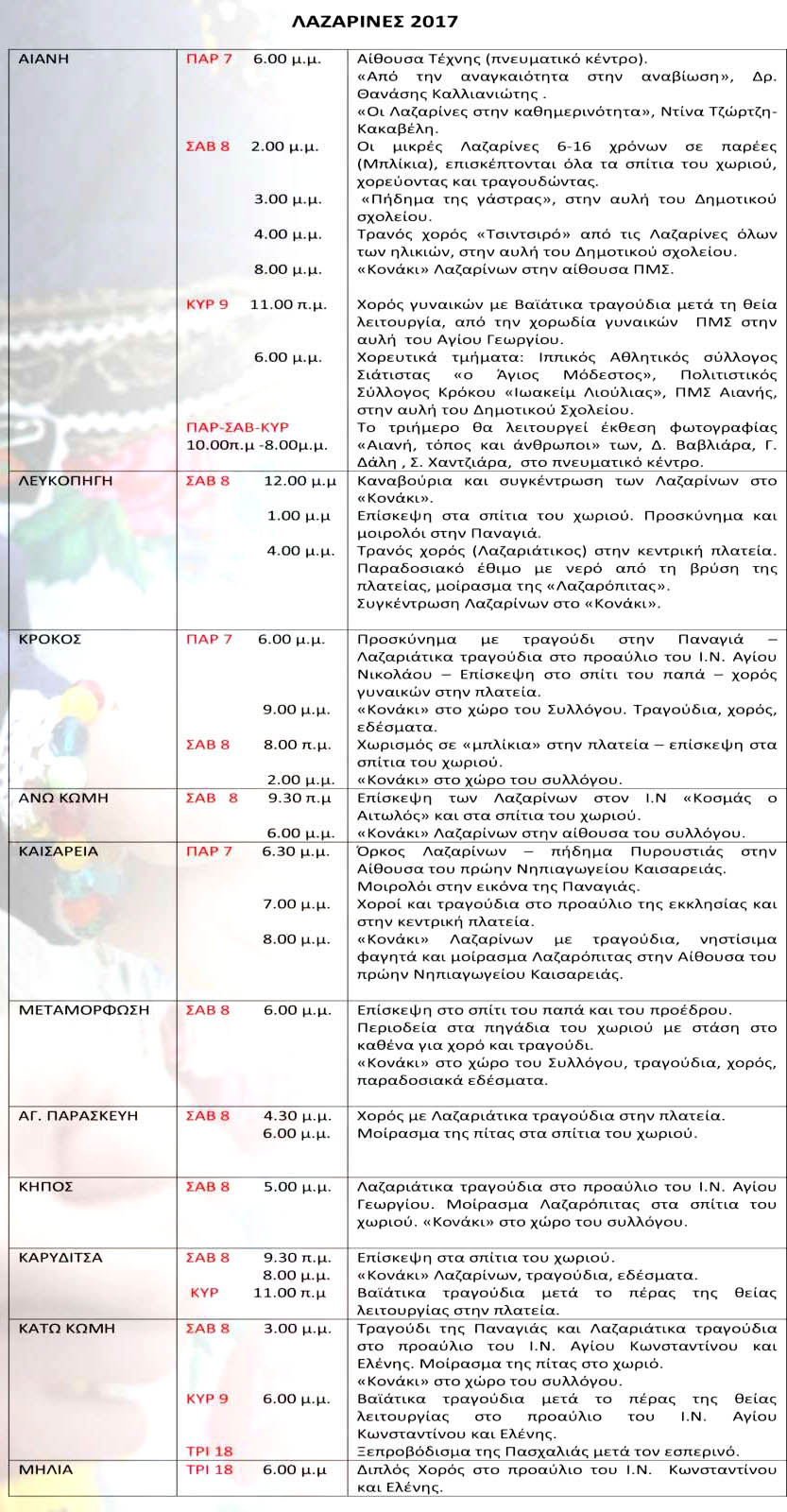 Το πρόγραμμα περιλαμβάνει το έθιμο των Λαζαρίνων σε 11 τοπικές κοινότητες από την Παρασκευή 7 έως και την Κυριακή 9 Απριλίου (Αιανή, Λευκοπηγή, Κρόκος, Άνω Κώμη, Καισαρειά, Κάτω Κώμη, Μεταμόρφωση, Αγία Παρασκευή, Κήπος, και Καρυδίτσα) και το έθιμο του Διπλού Χορού στη Μηλιά στην Τρίτη 18 Απριλίου 2017.