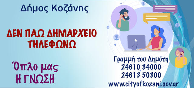 Ο Δήμος Κοζάνης έχοντας ως στόχο την προάσπιση της δημόσιας υγείας και μοναδικό γνώμονα την προστασία των δημοτών, καλεί όλους του πολίτες να μειώσουν στο ελάχιστο την προσέλευσή τους στο Δημαρχείο, καθώς και σε όλες τις υπηρεσίες του.