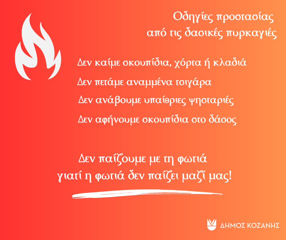Παράλληλα, η Πολιτική Προστασία του Δήμου Κοζάνης απευθύνει ισχυρή σύσταση στους συνδημότες μας να είναι ιδιαίτερα προσεκτικοί και να αποφεύγουν οποιαδήποτε υπαίθρια δραστηριότητα, που θα μπορούσε να προκαλέσει φωτιά.